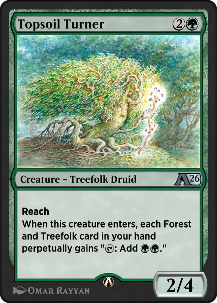 When this creature enters, each Forest and Treefolk card in your hand perpetually gains " : Add ."